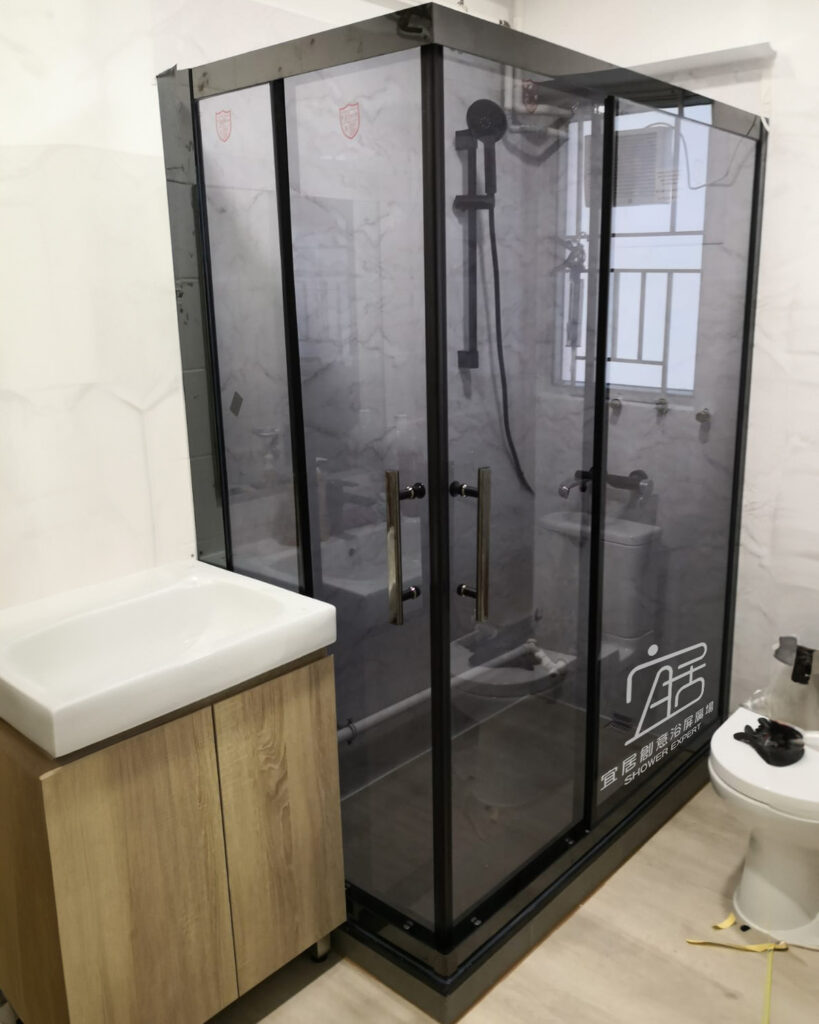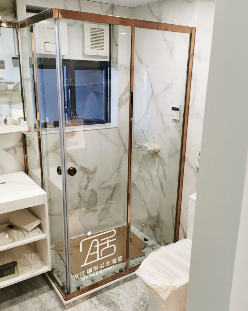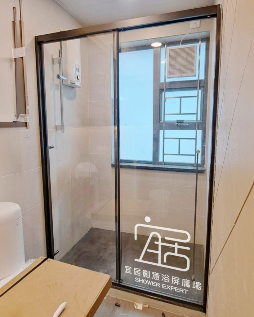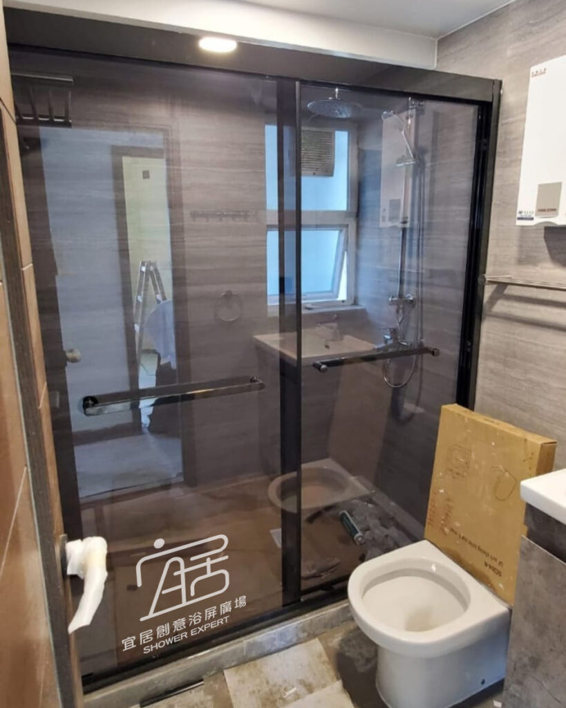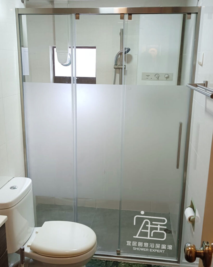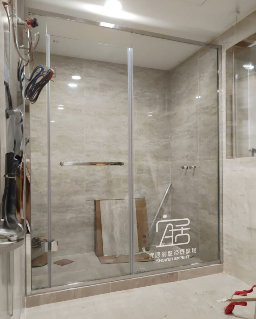 AT-01~不銹鋼鑽石型趟門浴屏,鑽石形的特點就是按照原來的跌級形狀,再按客人要求的尺寸訂造。例如此新型居屋單位,一邊坐廁一邊洗面盆,中間位較闊,我選擇中間兩邊開門。設計上門夠闊,出入方便,不會碰到洗手盤及座廁。
