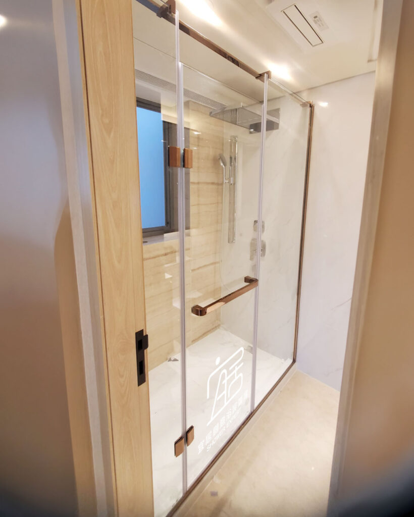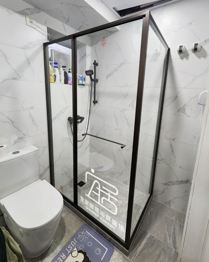 AT-01~不銹鋼鑽石型趟門浴屏,鑽石形的特點就是按照原來的跌級形狀,再按客人要求的尺寸訂造。例如此新型居屋單位,一邊坐廁一邊洗面盆,中間位較闊,我選擇中間兩邊開門。設計上門夠闊,出入方便,不會碰到洗手盤及座廁。